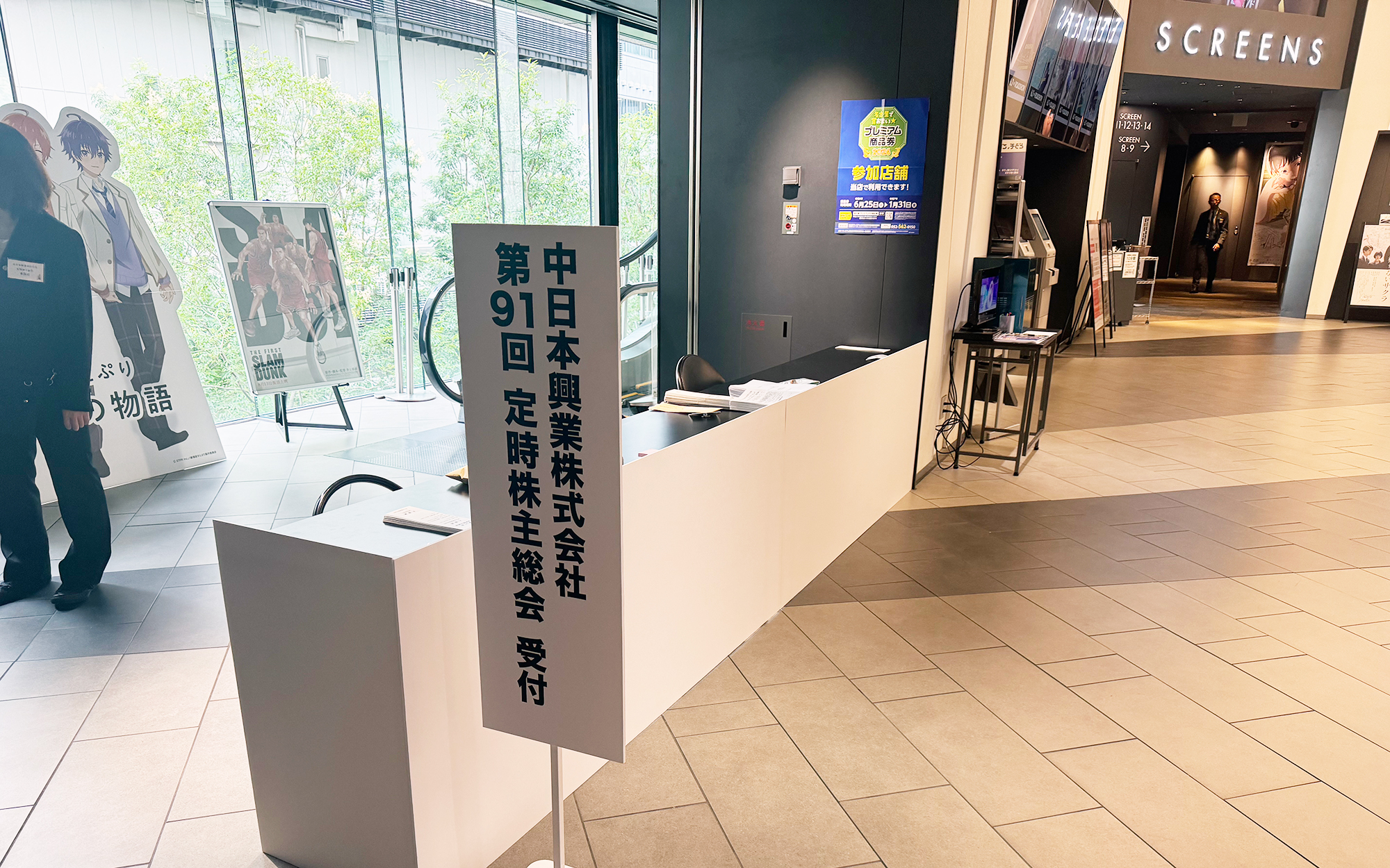 毎年6月にミッドランドスクエア シネマにて開催される、中日本興業株式会社の株主総会における案内看板の制作および設置施工を担当いたしました。